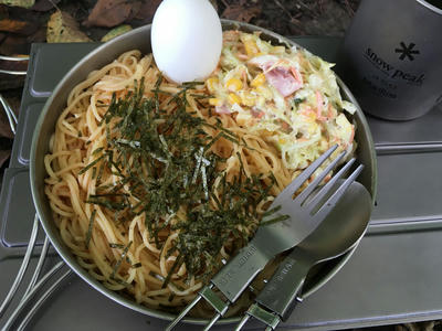 本日のモーニングは、たらこスパゲティとコールスローと半熟ゆで卵。うみゃ〜!