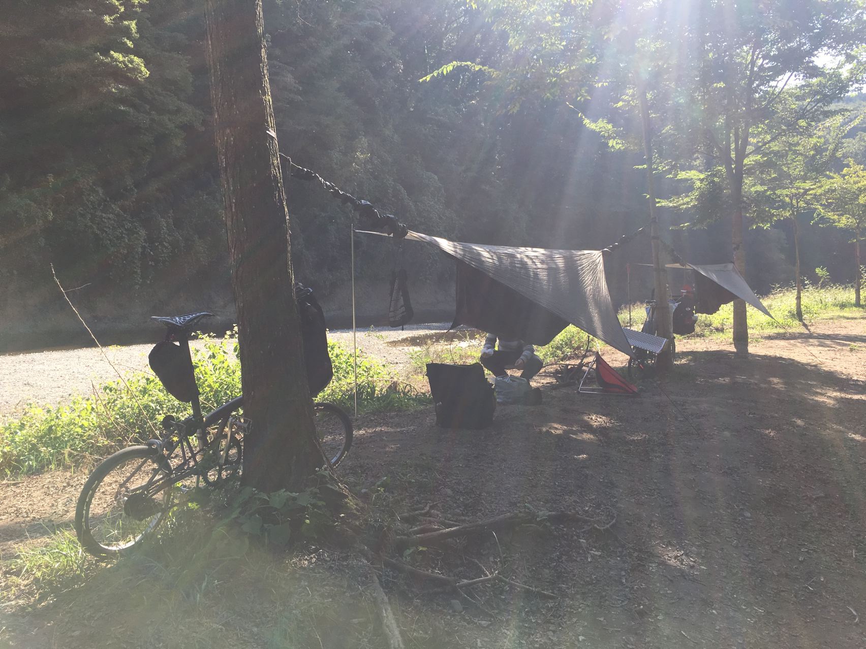 リョウさんのタープは木の枝がポールに。まさしくブッシュクラフト!