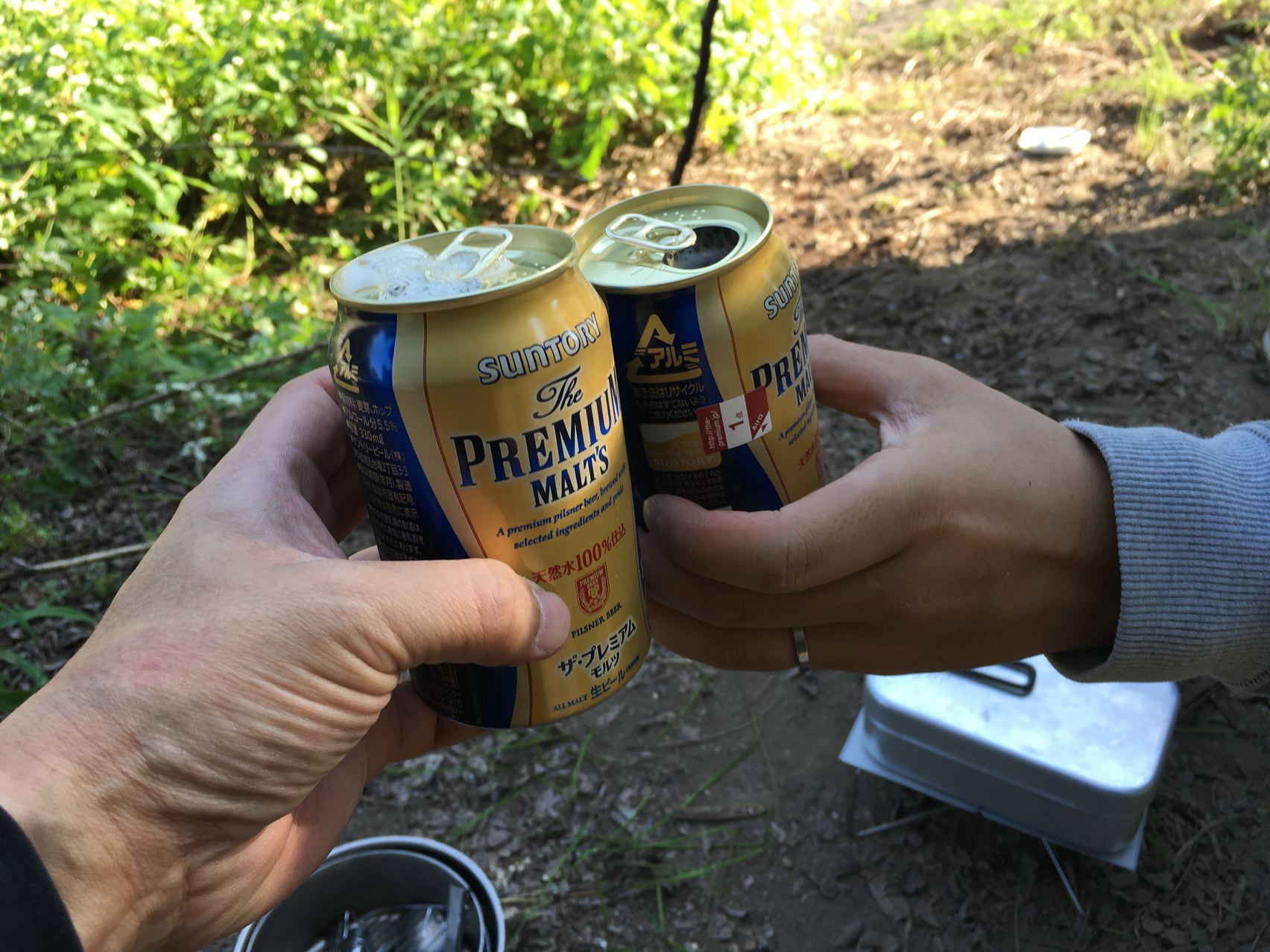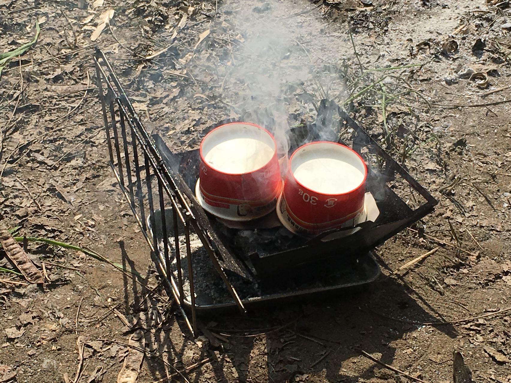 リョウさんは自作の焚火台にてひたすら焚火。そろそろ飲るか。