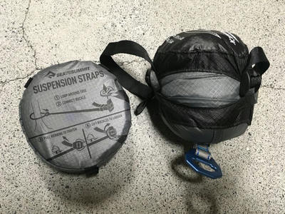 ならばミノムシ型とか。この様に後から何かハンモックに通したい時にはストラップの金物を一旦ちょこっと外すだけなので非常に便利です(ヘネシーだと結び直し)