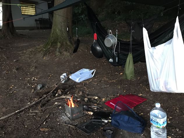 そして、ちゃんと焚火台の下にはステンレストレー敷いてる。地面へのダメージを回避する本物のアウトドアマンなのか?焚火台は、笑’sのなんちゃらがどうちゃらって言ってたな。クッカーは相変わらず蓋付きのちびパンのみ。むむぅ。