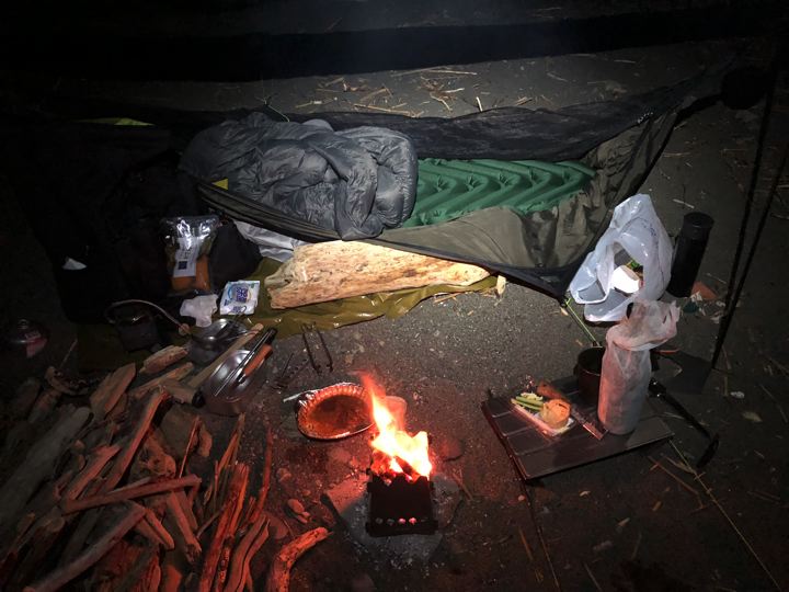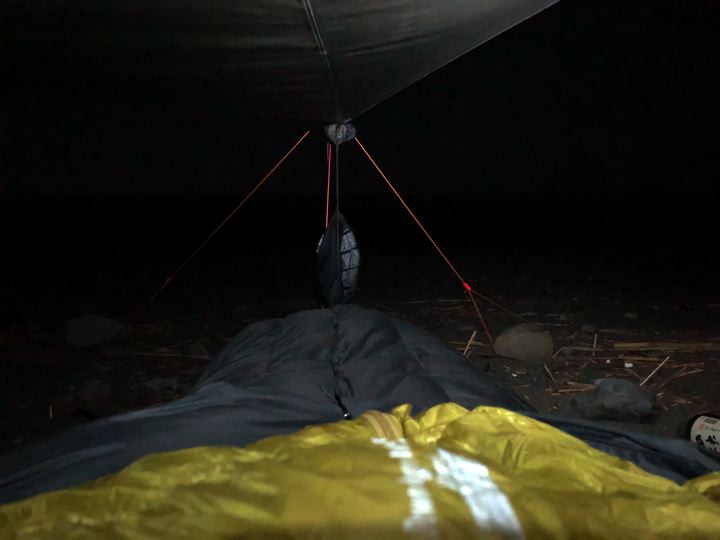 今宵の寝床はこんな感じ。グランドシート敷いて、ハンモックウォーマー挟んで、ヘネシーハンモック。上はクライミットのエアマットにモンベルとアテパのダウン。エア枕も久々の登場。