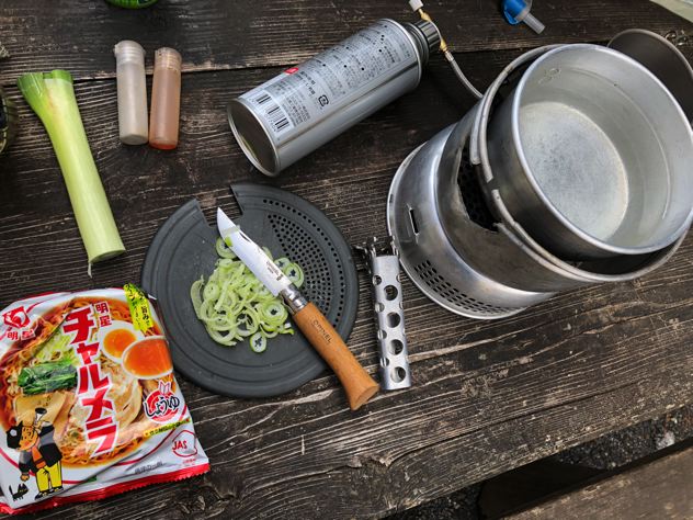 お腹すいたので、設営前に速攻チャルメラ!ストームクッカーの湯ぎり蓋をまな板にして葱カット!