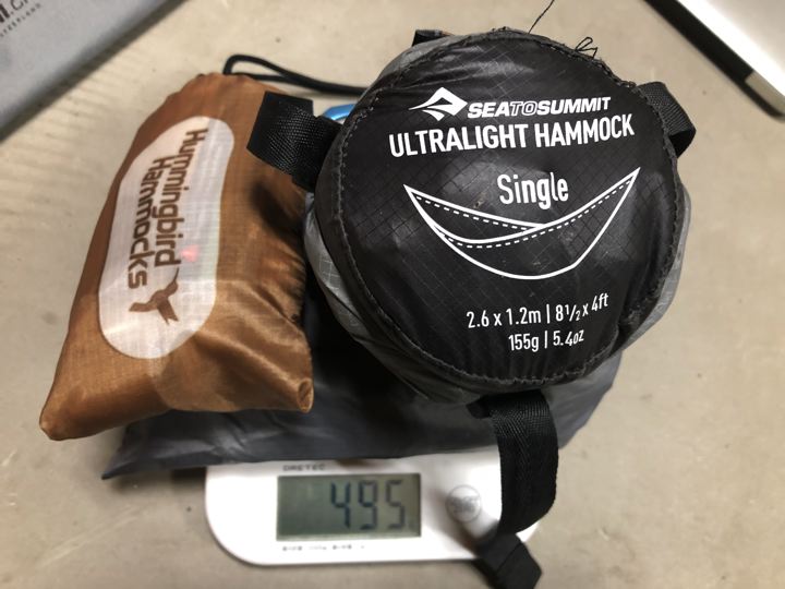 ハンモックとツリーストラップとペグ2本とタープ全部込みで495g。