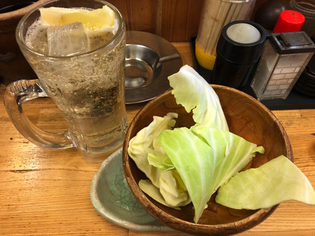 お通しのキャベツはおかわり自由。ハイボールでスタート。