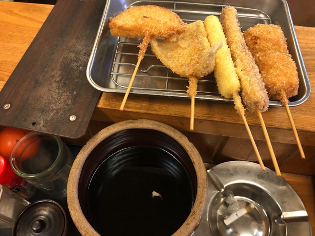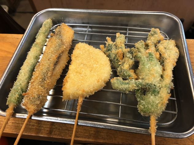 串揚げ5本セット。(タマネギ、カマンベールチーズ、ウインナー、キス、豚肉)
